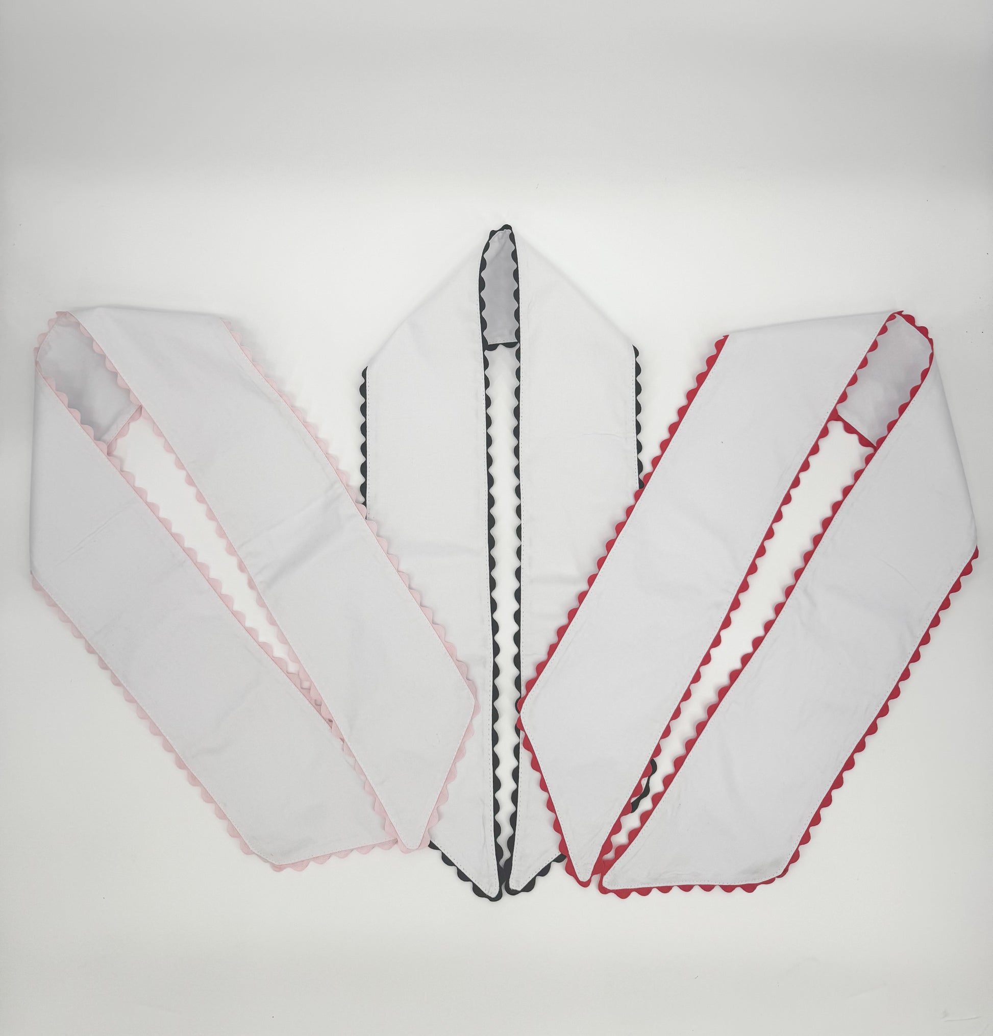 These fun wreath sashes come with three choices of trim - black, red, and pink! The scalloped ric rac trim gives them a pop of personality and are perfect for embroidery.